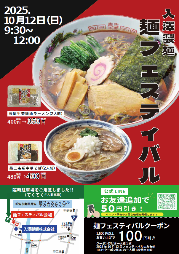 第6回麺フェスティバルのご案内 2025.10.10 お知らせ2025年10月12日 (日) 9:30~12:00弊社敷地内の特設会場にて、麺フェスティバル(工場直売会)を行います。 たくさんのご来場をお待ちしております。(お支払いは現金のみです。)